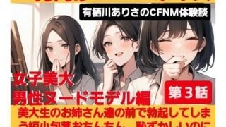 2025年10月1日発売、サークル「CFNM女学園」制作の「M男向けCFNMボイス 有栖川ありさのCFNM体験談 男性ヌードモデル編 【第3話】 恥ずかしい短小包茎を描かれちゃう童貞君。女子大生のお姉さん達の目の前でチンポが勃起してしまい…!」の最新ダウンロード情報です。