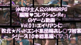 沙耶はオーディションの結果、あるMMORPGの主人公の座を勝ち取りました。その名も『編隊Collection』。武装した女の子達が、敵エイリアン勢力「汁MENZ」(シルメンズ)を撃退するために立ち上がるというストーリーです。露出の激しい女性キャラが目白押しのため、ゲームの随所にエッチな隠し要素が満載です(笑)今回はエイリアンに敗北して犯●れてしまうバッドエンドの様子をお届けしますヽ(゜▽、゜)ノ